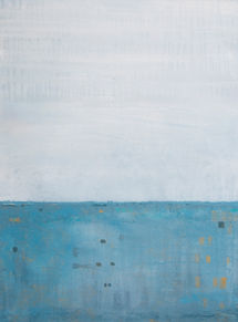 A study in simplicity, this work pairs a calm horizon with soft layers of turquoise and mist. Flecks of gold and shadowed squares lend modern intrigue, balancing serenity with quiet rhythm.